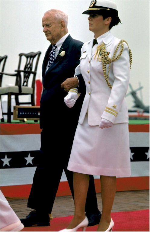 | 80k | DN-ST-92-04725. Norfolk Naval Station, 04 July 1991. An officer escorts retired ADM Arleigh Burke to his seat for the commissioning ceremony of the guided-missile destroyer USS Arleigh Burke (DDG 51), named in his honor. US Navy photo by PH1 (SW) Jeff Elliott. | Robert M. Cieri | |