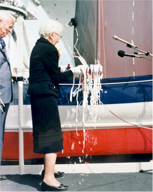 | 119k | DN-SC-90-01368. Bath Iron Works, ME, 16 September 1989. Mrs. Roberta Burke, ship's sponsor, christens the guided-missile destroyer USS Arleigh Burke (DDG 51), as her husband, former Chief of Naval Operations Admiral Arleigh Burke, watches with interest. BIW photo. | Robert M. Cieri | |