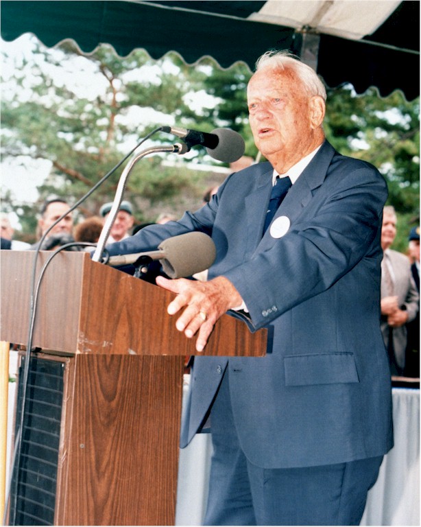 | 123k | DN-SC-90-01369. Bath Iron Works, ME, 16 September 1989. former Chief of Naval Operations Admiral Arleigh Burke speaks at the christening/launch ceremony for the guided-missile destroyer USS Arleigh Burke (DDG 51). BIW photo. | Robert M. Cieri | |