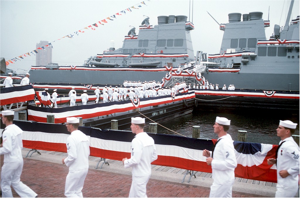 | 202k | DN-ST-92-02356. Naval Station Norfolk, 04 July 1991. The crew run aboard the guided-missile destroyer USS Arleigh Burke (DDG 51) to man the rails bringing the ship to life, at her commissioning. US Navy photo by PH1 Michael D. P. Flynn. | Robert M. Cieri | |