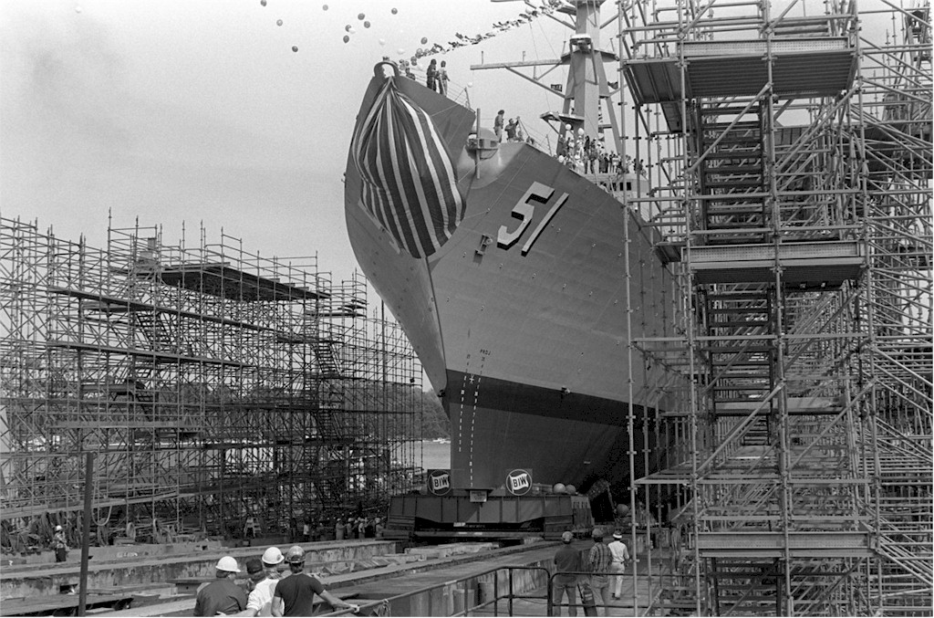| 252k | The guided missile destroyer USS Arleigh Burke (DDG 51) slides down the ways at the launching ceremony, 16 September 1989. Photo courtesy of Bath Iron Works, Bath ME. | Bill Gonyo | |