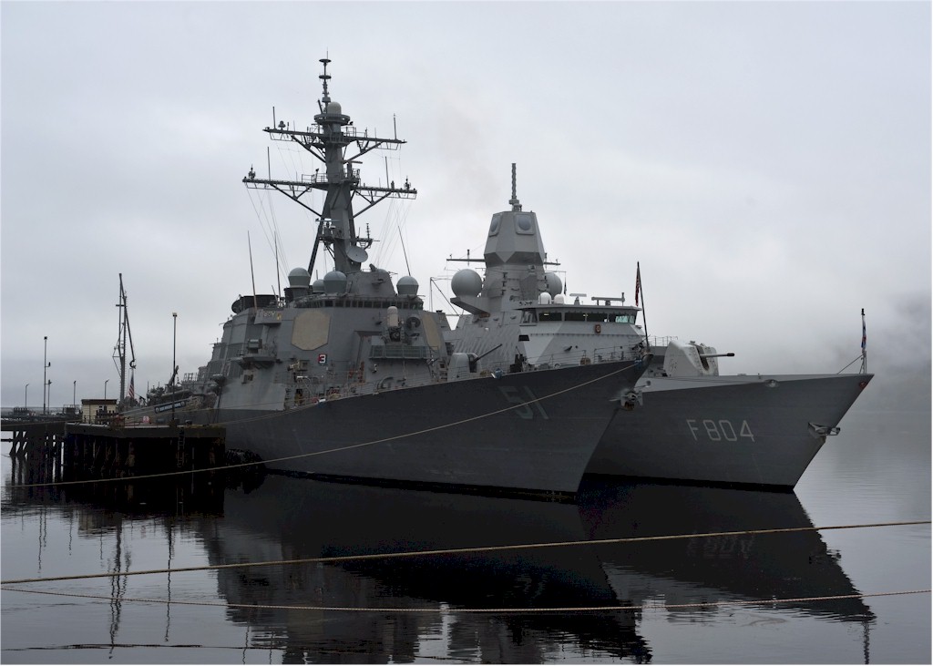 | 109k | The Royal Netherlands Navy frigate HNLMS De Ruyter (F804) is moored alongside the guided-missile destroyer USS Arleigh Burke (DDG-51), at Faslane, Scotland, on 2 October 2011. Arleigh Burke is deployed to participate in Exercise Joint Warrior 2011-2. Joint Warrior serves as a certifying event for ships deploying with coalition forces in future operations. U.S. Navy photo by Mass Communication Specialist 3rd Class Scott Pittman. Image # 111002-N-FI736-010. | Robert Hurst | |