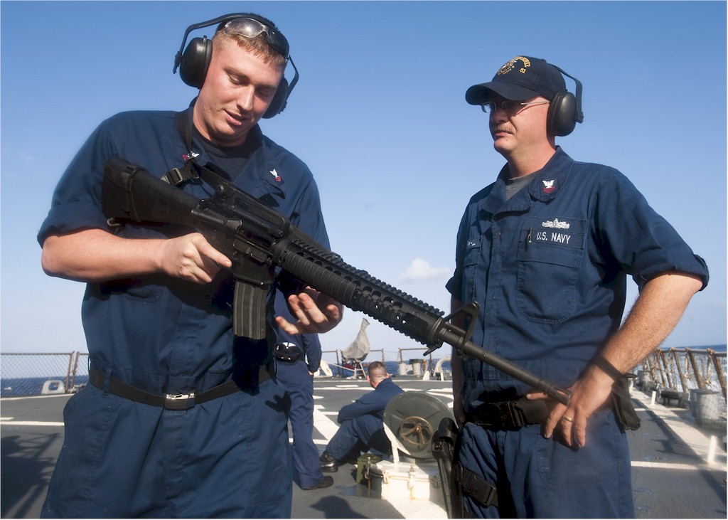 | 147k | 111026-N-FI736-049. Atlantic Ocean, October 31 2011, Fire Controlman 1st Class Jason Parkhill teaches Operations Specialist Second Class Carl Young the weapon conditions of an M-16rifle during a live fire exercise aboard guided-missile destroyer USS Arleigh Burke (DDG 51). Arleigh Burke is continuing its independent deployer certifications after completing Exercise Joint Warrior 2011-2. U.S. Navy photo by Mass Communication Specialist 3rd Class Scott Pittman. | Bill Gonyo | |
