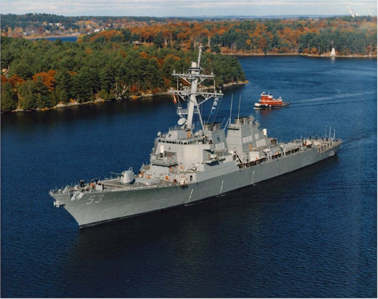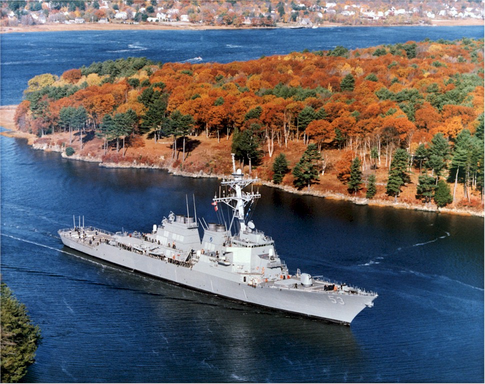 | 124k | USS John Paul Jones DDG-53 steaming down the Kennebec River as she departs the Bath Iron Works (BIW) Bath, ME for the first time August 20, 1993. | Steven A. Cardali |