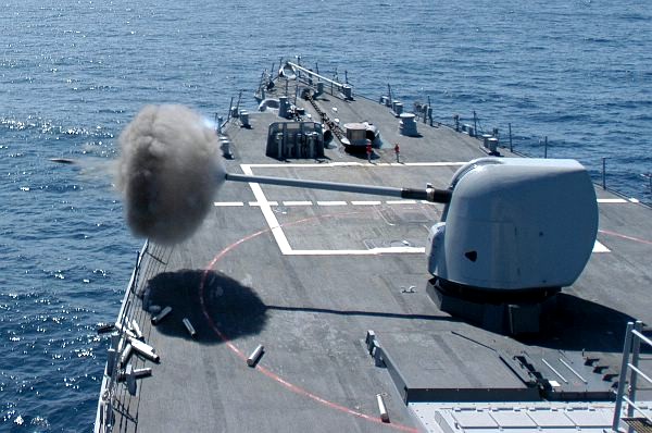 | 80k | Pacific Ocean, Aug. 9, 2003, the guided missile destroyer USS John Paul Jones (DDG 53) fires a five-inch round from a Mk-45 5-inch gun (5" 54 cal.) during a live-fire exercise. The Mk-45 is a lightweight gun providing surface combatants accurate naval gunfire against fast, highly maneuverable, surface targets, air threats and shore batteries during amphibious operations. U.S. Navy Photo | Fred Weiss |
