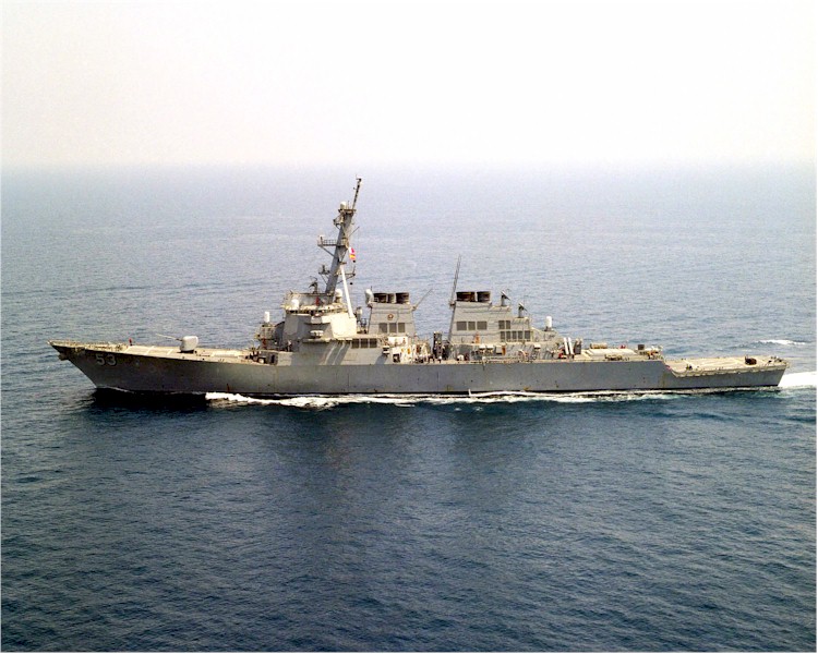 | 117k | 010905-N-6259P-002, Forward Deployed in the Arabian Gulf September 5 2001, the guided missile destroyer USS John Paul Jones (DDG 53) awaits the return of a helicopter slung with cargo during a vertical replenishment operation. John Paul Jones is currently underway in the Arabian Gulf in support of Operation Southern Watch. U.S. Navy Photo by Photographer's Mate 3rd Class Douglas M. Pearlman. | Bill Gonyo |