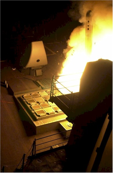 | 49k | 011008-N-3236B-001, aboard USS John Paul Jones, October 8 2001, a "Tomahawk" land attack missile (TLAM) is launched from aboard the guided missile destroyer USS John Paul Jones (DDG 53) in a strike against al Qaida terrorist training camps and military installations of the Taliban regime in Afghanistan on Oct. 8, 2001. The John Paul Jones is steaming at sea as part of Operation Enduring Freedom. U.S. Navy photo by Photographer's Mate 1st Class Ted Banks. | Tony Cowart |