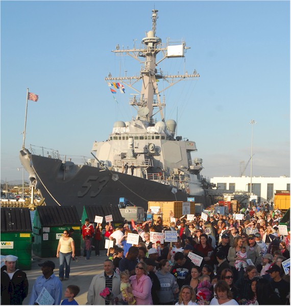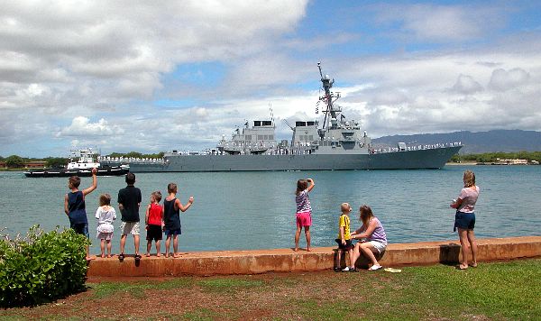 | 55k | 042806-N-0373Q-855, Naval Station Pearl Harbor, HI, June 29 2004, family members at Hickam Air Force Base welcome the Arleigh Burke-class guided missile destroyer USS John Paul Jones (DDG 53) as the ship transits the channel into Pearl Harbor, Hawaii. John Paul Jones is visiting Pearl Harbor to take part in Rim of the Pacific (RIMPAC) 2004. U.S. Navy photo by Journalist 2nd Class Mario A. Quiroga. | Tony Cowart |