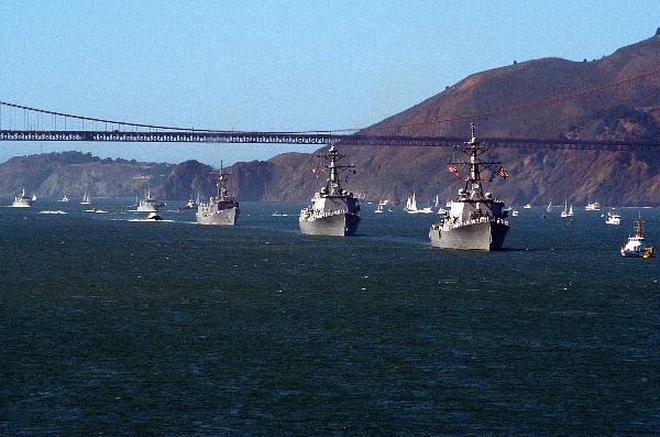 | 57k | 041009-N-7217H-016, San Francisco Bay, CA, October 9 2004, from right, the guided missile destroyers USS John Paul Jones (DDG 53) and USS Momsen (DDG 92), and the guided missile frigate USS Jarrett (FFG 33) sail into San Francisco Bay, Calif., at the start of Fleet Week 2004. U.S. Navy photo by Photographer's Mate 1st Class Marvin Harris. | Tony Cowart |