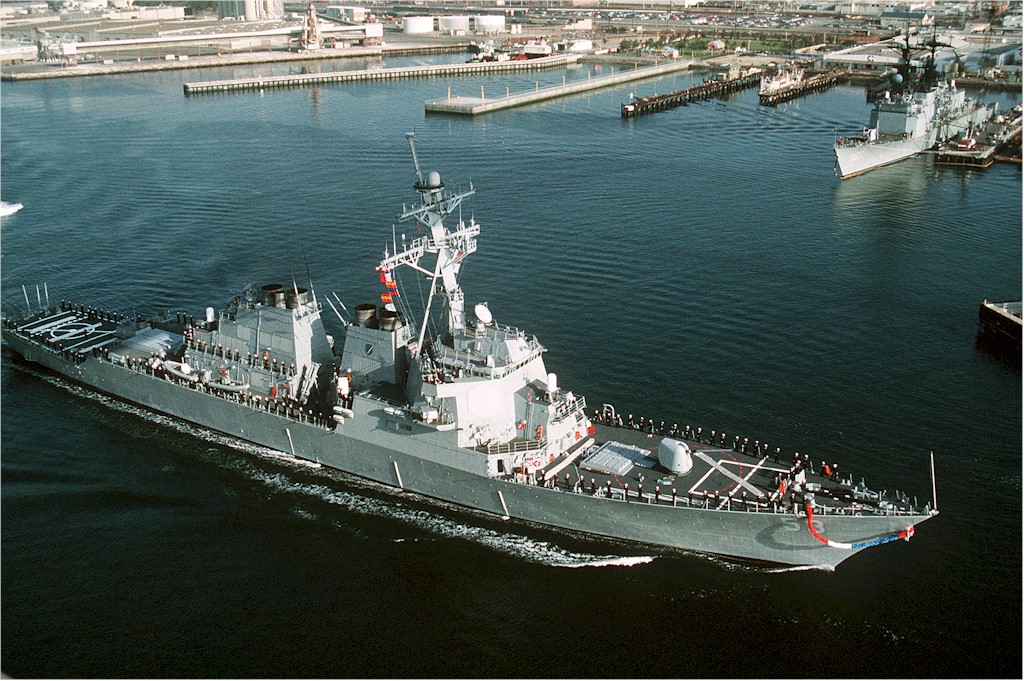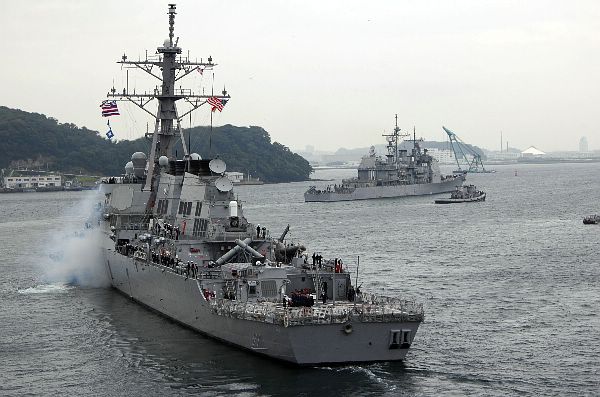 | 54k | 051011-N-7883G-043, Yokosuka, Japan, October 11 2005, the guided missile destroyer USS John Paul Jones (DDG 53) and the guided missile cruiser USS Cowpens (CG 63) depart Truman Bay for a fall underway period. John Paul Jones and Cowpens are currently assigned to the Kitty Hawk Carrier Strike Group, forward-deployment in Yokosuka, Japan. U.S. Navy photo by Photographer's Mate Airman Kyle D. Gahlau. | Tony Cowart |