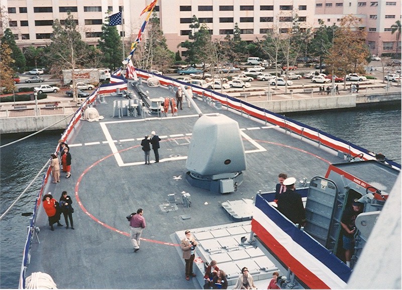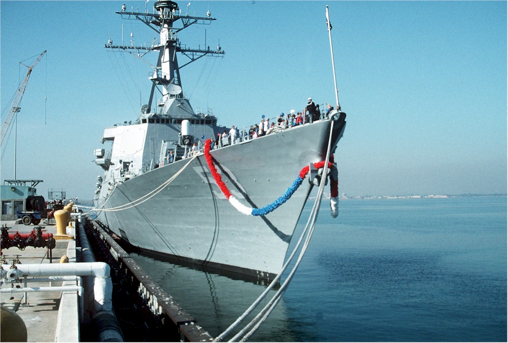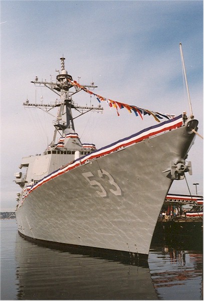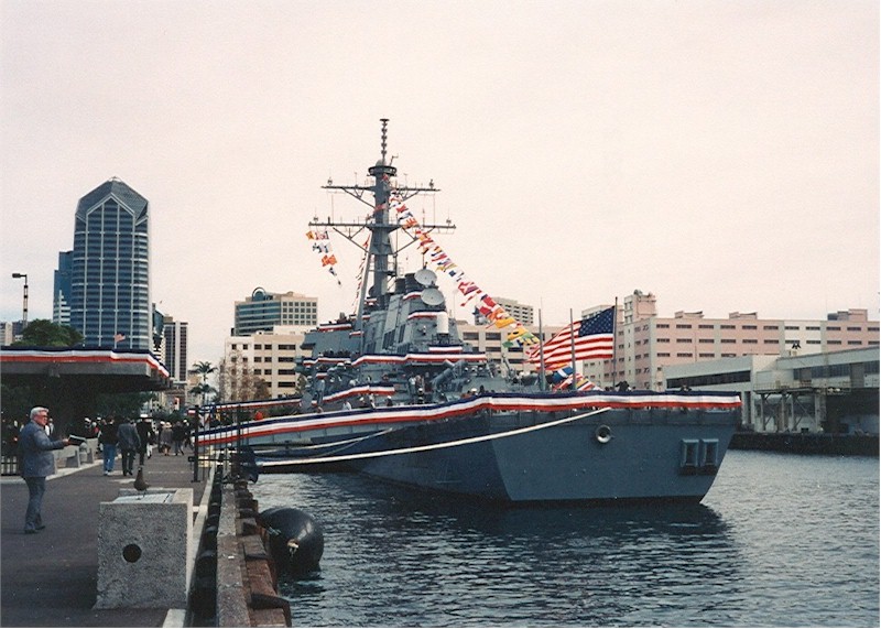 | 259k | DN-ST-94-01404. San Diego, December 1 1993, the guided-missile destroyer USS John Paul Jones (DDG-53) enters San Diego Harbor for the first time with crew members "Manning the Rails". The ship will be permanently homeported at the 32nd St. Naval Station. The John Paul Jones is the first Arleigh Burke-class ship to be stationed on the West Coast. U.S. Navy photo. | Robert M. Cieri |