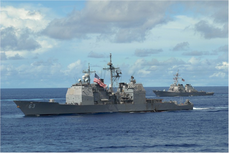 | 86k | 070814-N-3541A-172. USS Cowpens (CG 63) and USS John Paul Jones (DDG 53) steam along during Valiant Shield's joint photo exercise while in the Pacific Ocean Aug. 14, 2007. The joint exercise consists of 28 naval vessels, more than 300 aircraft, and approximately 20,000 serv ice members from the Navy, Army, Air Force, Marine Corps and Coast Guard. U.S. Navy photo by Mass Communication Specialist 2nd Class Davis Anderson, August 14 2007. | Bill Gonyo |