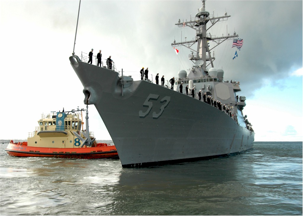 | 147k | 080124-N-4995K-066. San Diego, January 24 2008, a tugboat assists the guided-missile destroyer USS John Paul Jones (DDG 53) as it prepares to depart San Diego, Calif., on a scheduled four-month deployment. U.S. Navy photo by Mass Communication Specialist 3rd Class Chelsea Kennedy. | Robert M. Cieri |