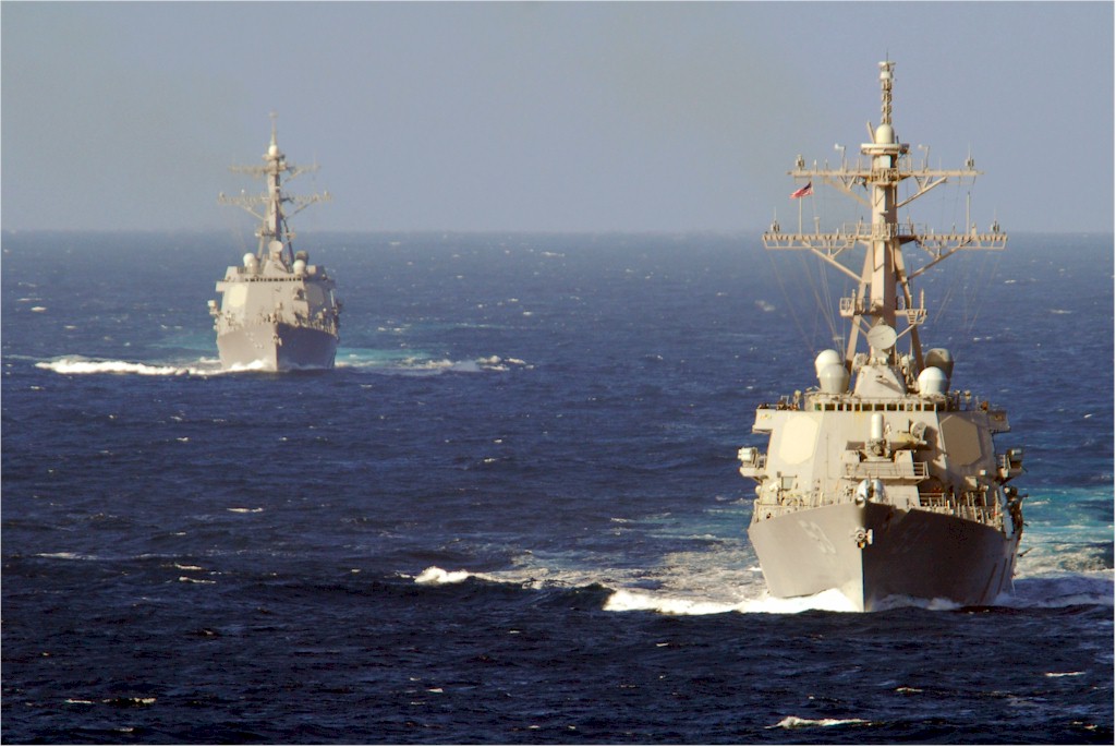 | 59k | 050623-N-5781F-279, Coral Sea, June 23 2005, the guided missile destroyer USS Fitzgerald (DDG 62), foreground, and the guided missile destroyer USS John Paul Jones (DDG 53) underway in formation in preparation to fire the ship's MK-45 5-inch lightweight guns during a ship sinking exercise. Fitzgerald and John Paul Jones are currently operating in the Coral Sea in support of Exercise Talisman Sabre 2005. U.S. Navy photo by Photographer’s Mate 3rd Class Bo J. Flannigan. | Tony Cowart |