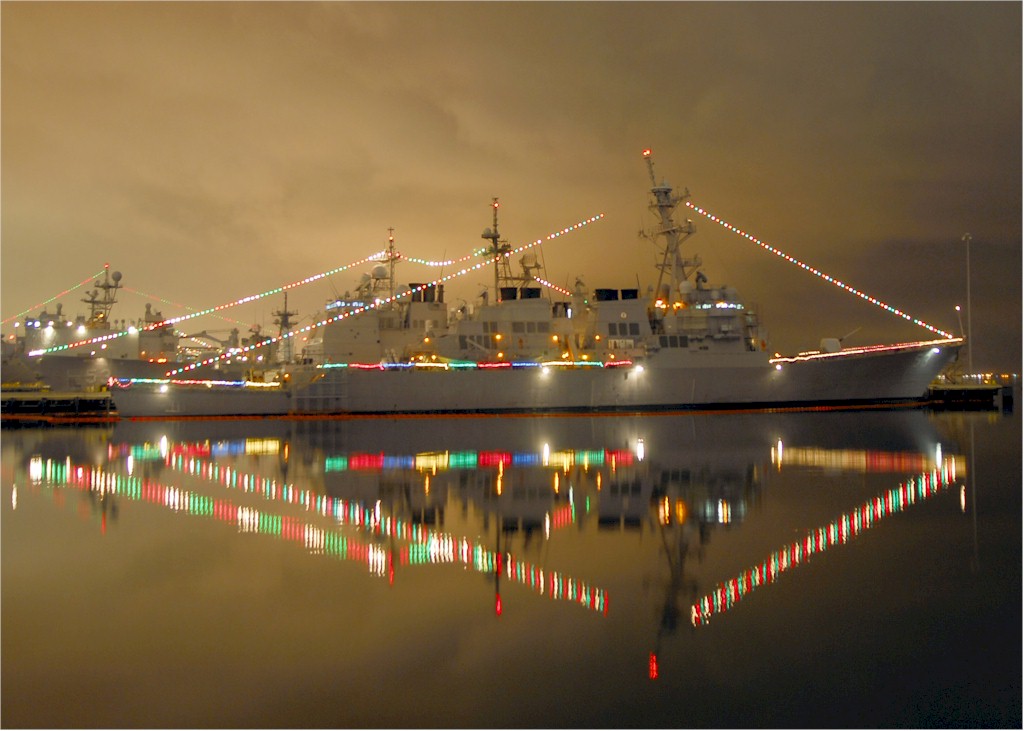 | 135k | 071219-N-4658L-110. San Diego, December 19 2007, the guided-missile destroyer USS John Paul Jones (DDG 53) moored pier-side, ready for a judging panel's inspection during the 2007 holiday ship decoration contest. Ships and shore commands were judged on four criteria: degree of difficulty, originality of display, holiday spirit and creativity. U.S. Navy photo by Mass Communication Specialist 2nd Class Mark A. Leonesio. | Robert M. Cieri |