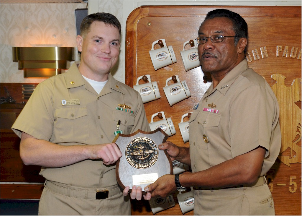 | 193k | 091117-N-0569T-034. San Diego, November 17 2009, the Surface Warfare Officer of the Year award is presented to Lt. Cmdr. Jeffrey Tamulevich, left, by Vice Adm. D. C. Curtis, commander, Naval Surface Forces, aboard the guided-missile destroyer USS John Paul Jones (DDG 53). Tamulevich, combat systems officer aboard John Paul Jones, was one of 25 nominees selected as the first-ever surface warfare officer. U.S. Navy photo by Mass Communication Specialist 2nd Class Daniel J. Taylor. | Bill Gonyo |