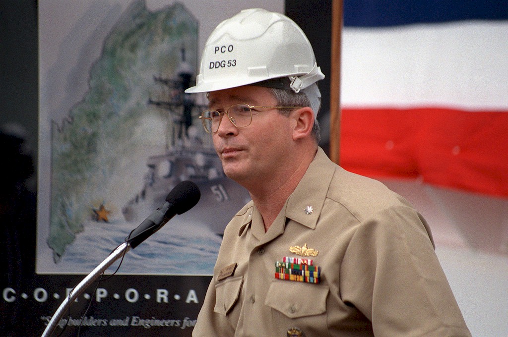 | 186k | Commander John M. Kelly, prospective commanding officer of the guided missile destroyer John Paul Jones (DDG 53), speaks at a press conference prior to the vessel's christening and launch, scheduled for October 26th at Bath Iron Works Shipyard. | Bill Gonyo |