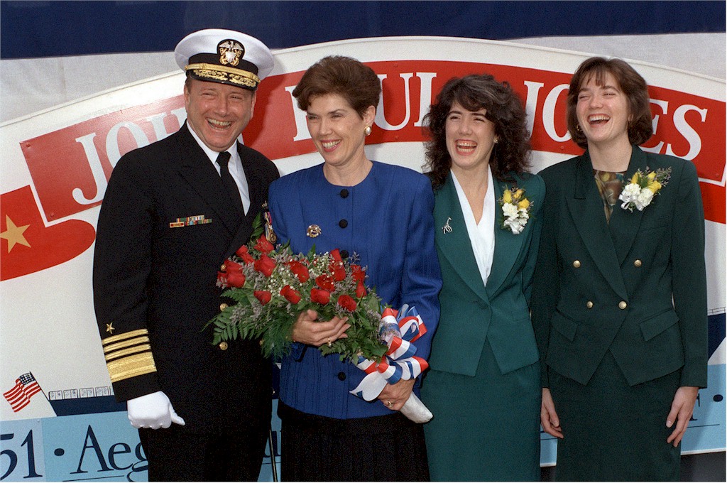| 229k | The Jeremiah family poses for a photograph following the christening and launch of the guided missile destroyer John Paul Jones (DDG 53) at Bath Iron Works Shipyard. Connie Jeremiah was the ship's sponsor while her daughters Krista and Jodi acted as her maids of honor. ADM David E. Jeremiah, vice chairman, Joint Chiefs of Staff, spoke during the ceremony. | Bill Gonyo |