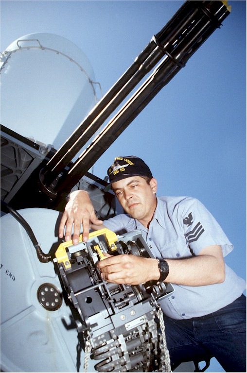 | 113k | Fire Control Technician First Class (FC1) Jim Begalla performs preventative maintenance checks on the Mark 15 Phalanx Close-in weapons System (CIWS) on board the guided missile destroyer USS John Paul Jones (DDG 53). | Bill Gonyo |