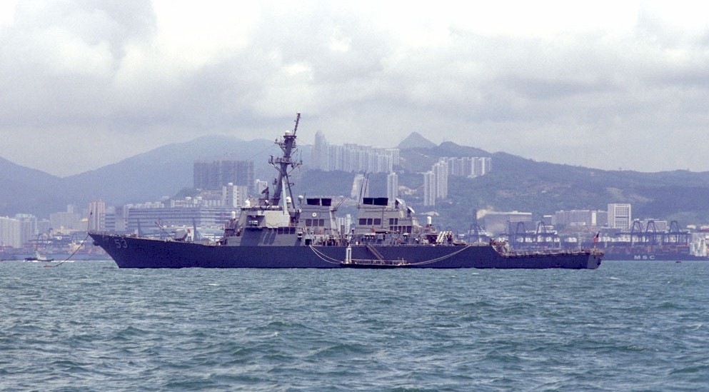 | 130k | USS John Paul Jones (DDG 53) tied to mooring buoy, Hong Kong, 1 September 1997. Photo by Karsten Petersen. | Robert Hurst |