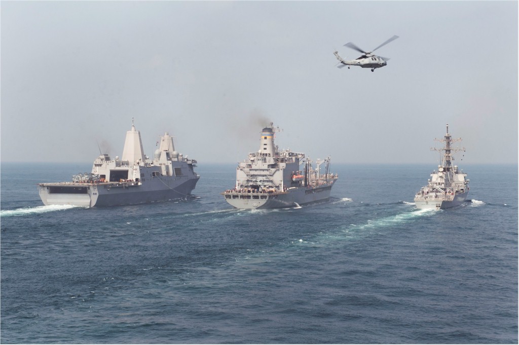 | 123k | 120214-N-KS651-188. Arabian Sea, February 14 2012, the Military Sealift Command fleet replenishment oiler USNS Patuxent (T-AO 201), center, conducts a simultaneous replenishment at sea with the amphibious transport dock ship USS New Orleans (LPD 18), left, and the guided-missile destroyer USS John Paul Jones (DDG 53). New Orleans and John Paul Jones are operating in the U.S. 5th Fleet area of responsibility as part of the Makin Island Amphibious Ready Group. (U.S. Navy photo by Mass Communication Specialist 2nd Class Jason Behnke. | Gary Priolo |