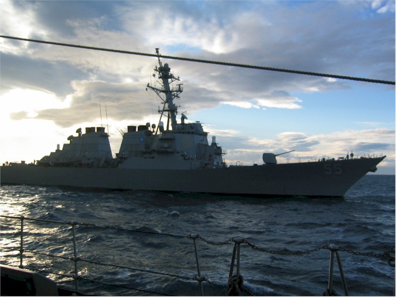 | 56k | 060429-N-1045B-006, Caribbean Sea, April 29 2006, Arleigh Burke-class destroyer USS Stout (DDG 55) prepares to join Nimitz-class aircraft carrier USS George Washington (CVN 73) for a joint anti-submarine warfare exercise and British Royal Navy Trafalgar-class submarine HMS Trafalger (S107). U.S. Navy photo by Photographer's Mate 3rd Class Michael D. Blackwell II. | Tony Cowart |