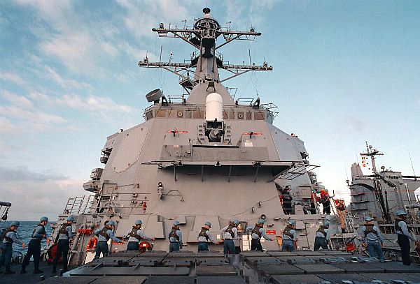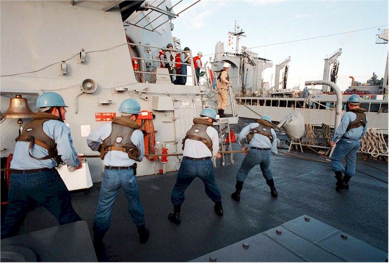 | 61k | 960203-N-2302H-003, aboard USS Stout, February 3 1999, linehandlers traverse the deck of the U.S.Navy’s Arleigh Burke Class Destroyer USS Stout (DDG 55) while taking up slack during an underway replenishment with the Cimarron Class Oiler USS Merrimack (AO(J)179) while transiting eastward in the Atlantic Ocean. USS Stout, commanded by CDR David Thorson, is part of the George Washington Battle Group. Members of the battle group departed their homeports in late January for a scheduled six-month deployment to the Mediterranean. Official U.S. Navy photo by Airman Joe Hendricks. | Tony Cowart |