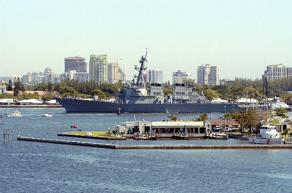 | 124k | Ft. Lauderdale, Fla., April 30 2002, the destroyers USS McFaul (DDG 74) and USS Stout DDG 55), foreground, are pier side at Port Everglades in Ft. Lauderdale, Fla. In the background are the destroyers USS Deyo (DD 989), USS Porter (DDG 78), and the cruiser USS San Jacinto (CG 56). The five ships and the carrier USS Harry S. Truman (CVN 75), all based in Norfolk, Va., are in Ft. Lauderdale for the 2002 Fleet Week/Air and Sea Show. U.S. Navy photo by Lt. Cmdr. Ed Buclatin. [020430-N-6092B-003] Apr. 30, 2002. | Fred Weiss |