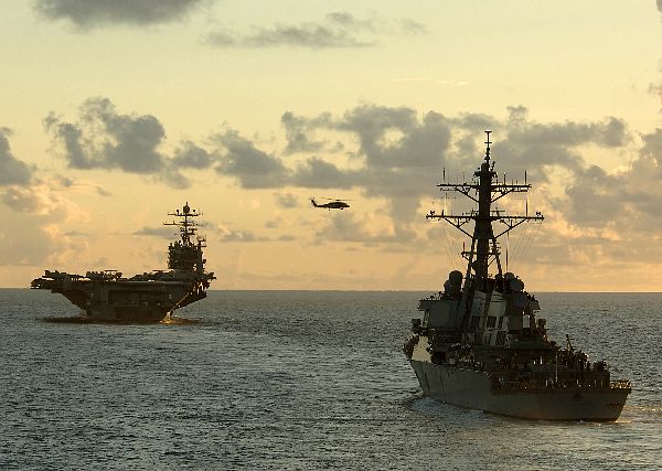 | 40k | 060429-N-8403A-010, Caribbean Sea, April 29 2006, guided missile destroyer USS Stout (DDG 55) pulls alongside the Nimitz-class aircraft carrier USS George Washington (CVN 73) in preparation for a strike group photo exercise. U.S. Navy photo by Photographer's Mate Airman Apprentice Jennifer Apsey. | Tony Cowart |