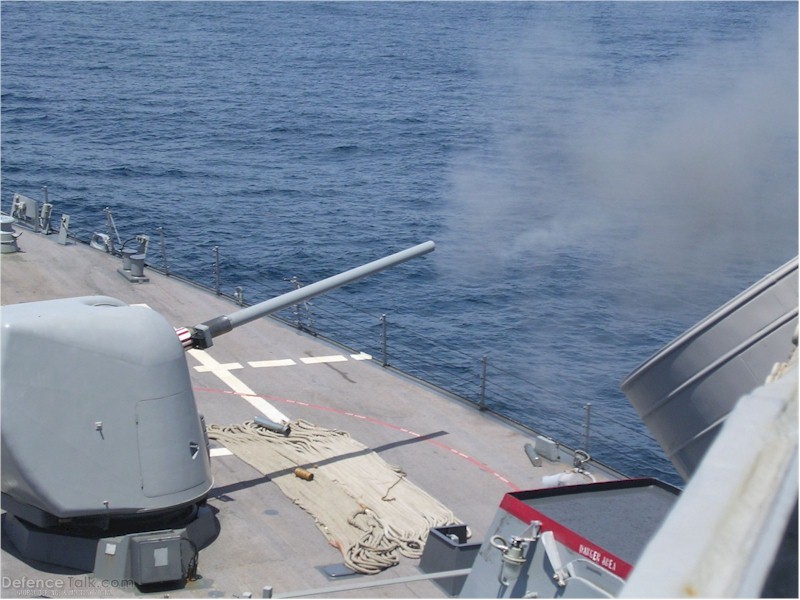 | 114k | Undated, location unknown. USS Stout (DDG-55) fires her forward mounted Mk-45/5" 54 cal. lightweight gun during a training exercise. Photo from DefenceTalk. | Bill Gonyo |