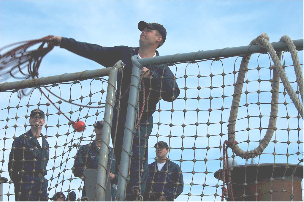 | 186k | 060524-N-0635C-578. May 24 2006, a sailor tosses a line over the side of the guided-missile destroyer USS Stout (DDG 55), as the ship returns to her homeport of Naval Station Norfolk, Va. The ship participated in Partnership of the Americas, a maritime training and readiness deployment of U.S. Naval forces with Caribbean and Latin American countries. U.S. Navy photo by: Lithographer 2nd Class Pamela Coxe. | Robert M. Cieri |