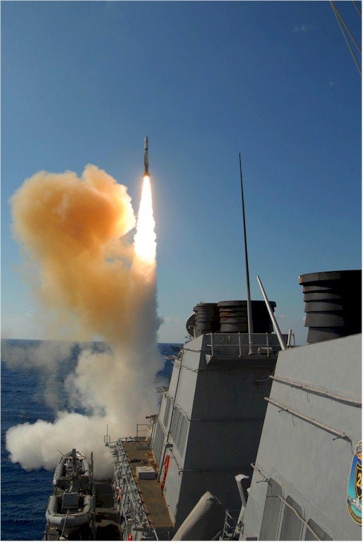 | 66k | 081006-N-9911M-031. Pacific Ocean, October 6 2008, the Arleigh Burke-class guided missile destroyer USS Stout (DDG 55) launches a SM-2 Standard Missile from the aft missile bay aboard at the ex-USS O'Bannon (DD 987) during a sinking exercise. The exercise demonstrated the ability for multiple strike group units to operate together effectively with precision in an operationally realistic exercise environment. U.S. Navy photo by Mass Communication Specialist 3rd class Zachary Martin. | Robert M. Cieri |