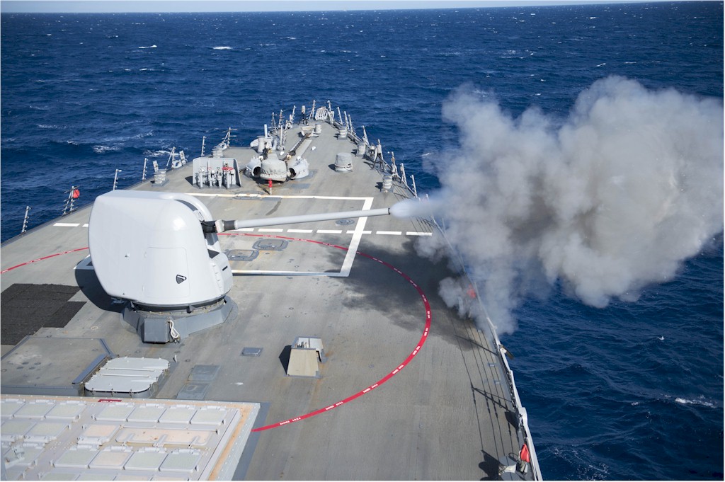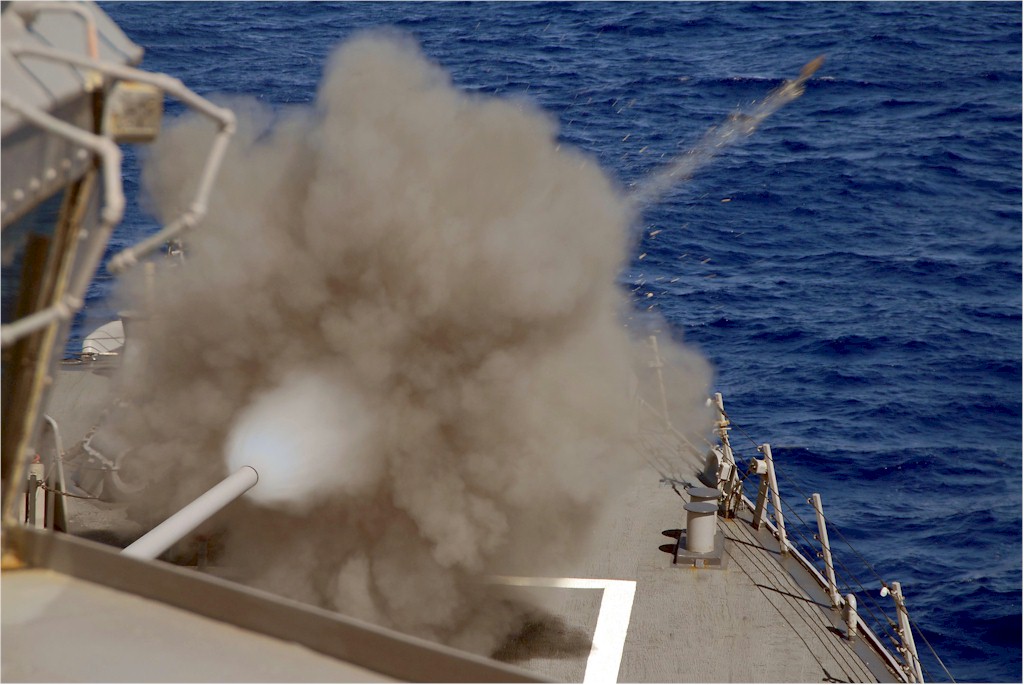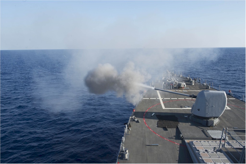 | 101k | 140127-N-UD469-330. Mediterannean Sea, January 27 2014, the Arleigh Burke-class guided-missile destroyer USS Stout (DDG 55) fires its Mk-45 5-inch lightweight gun during a live fire exercise. Stout is on a scheduled deployment supporting maritime security operations and theater security cooperation efforts in the U.S. 6th Fleet area of responsibility. U.S. Navy photo by Mass Communication Specialist 2nd Class Amanda R. Gray. | Ron Reeves |