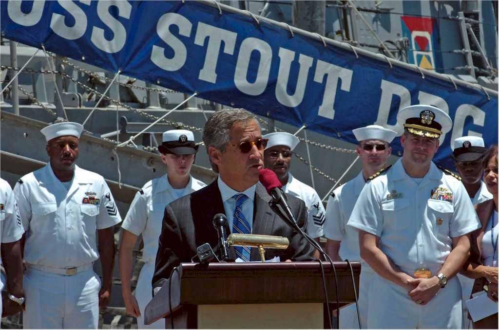 184k | 060417-N-5307M-388. Caucedo, Dominican Republic, April 17 2006, U.S. Ambassador to the Dominican Republic, Hans H. Hertell, addresses guided-missile destroyer USS Stout (DDG 55) Sailors about the opportunity between the Stout and the Dominican Navy working together. Stout is part of the George Washington Carrier Strike Group participating in Partnership of the Americas, a maritime training and readiness deployment of the U.S. Naval Forces with Caribbean and Latin American countries in support of Southern Command's (SOUTHCOM) objectives for enhanced maritime security. U.S. Navy photo by Photographer's Mate Airman Tristian Miller. | Bill Gonyo |