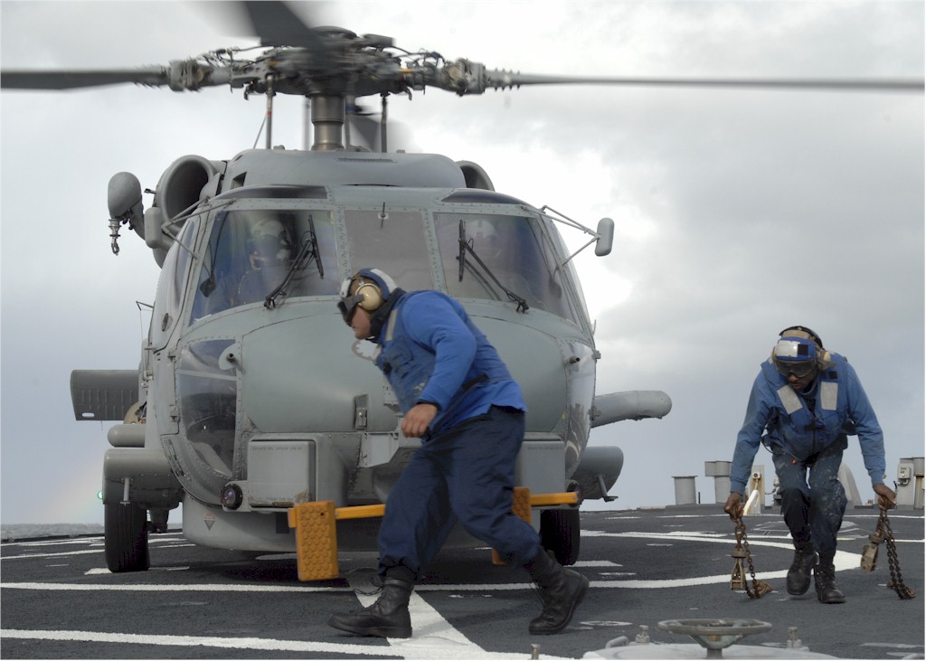 | 138k | 101005-N-2855B-060. Atlantic Ocean, October 5 2010, Boatswain's Mate 1st Class Ormon King signals to air personnel to chock and chain an SH-60B Seahawk helicopter attached to Helicopter Anti-Submarine Squadron (Light) 48, Detachment 5 on the flight deck of the guided-missile destroyer USS Stout (DDG 55) during routine flight operations while under way. Stout is participating in Joint Warrior 10-2, a United Kingdom-led multinational exercise designed to improve interoperability between allied navies and prepare participating crews to conduct combined operations during deployment. US Navy photo by MC1 (SW/AW) Molly A. Burgess. | Robert M. Cieri |