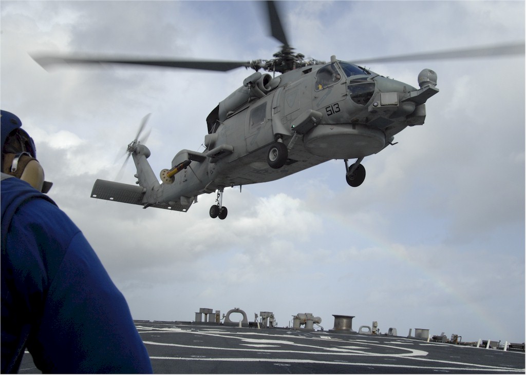 | 112k | 101005-N-2855B-141. Atlantic Ocean, October 5 2010, an SH-60B Seahawk helicopter attached to Helicopter Anti-Submarine Squadron (Light) 48, Detachment 5 lifts off from the flight deck of the guided-missile destroyer USS Stout (DDG 55) during routine flight operations while under way. Stout is participating in Joint Warrior 10-2, a United Kingdom-led multinational exercise designed to improve interoperability between allied navies and prepare participating crews to conduct combined operations during deployment. US Navy photo by MC1 (SW/AW) Molly A. Burgess. | Robert M. Cieri |