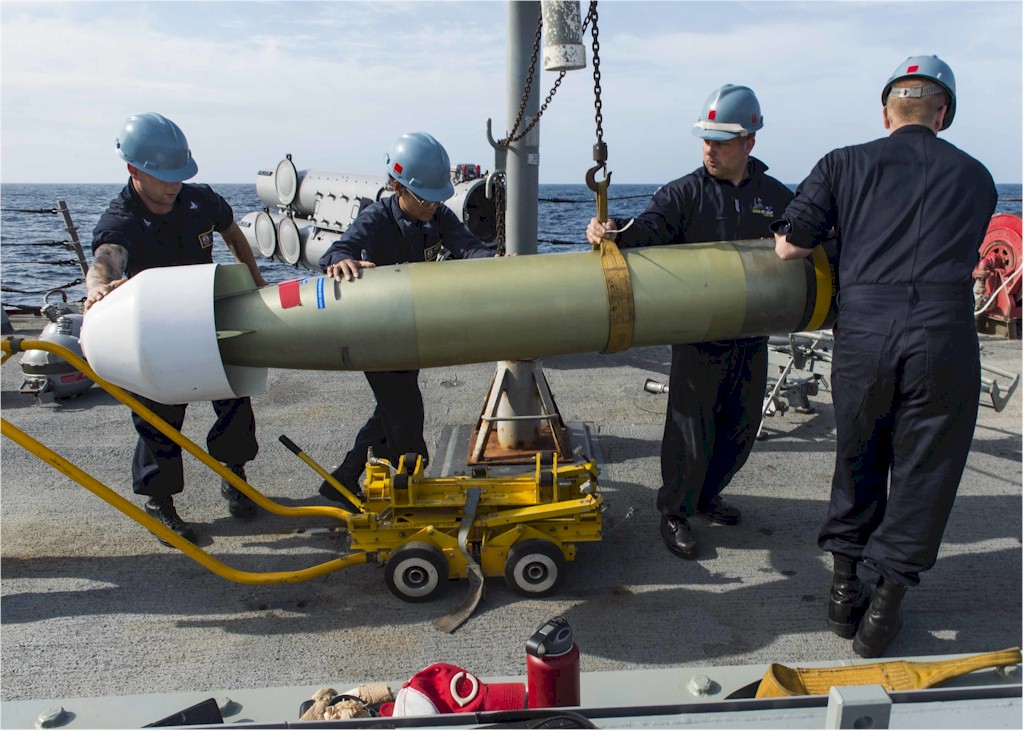 201k | 160518-N-GP524-187. Atlantic Ocean, May 18 2016, sailors assigned to the guided-missile destroyer USS Stout (DDG 55) transport an M-46 Torpedo. Stout is currently deployed as part of the Eisenhower Carrier Strike Group. U.S. Navy photo by Mass Communication Specialist 3rd Class Bill Dodge. | Ron Reeves |