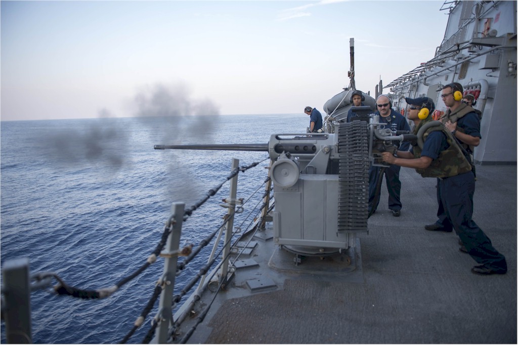 | 148k | 131119-N-UD469-167. Mediterranean Sea, November 19 2013, Gunner's Mate 2nd Class Gregory Spaulding fires rounds from the MK 38 25mm machine gun during a live fire exercise aboard the Arleigh Burke-class guided-missile destroyer USS Stout (DDG 55). Stout is on a scheduled deployment supporting maritime security operations and theater security cooperation efforts in the U.S. 6th Fleet area of responsibility. U.S. Navy photo by Mass Communication Specialist 2nd Class Amanda R. Gray. | Ron Reeves |