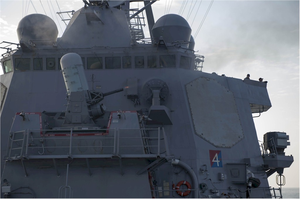 | 112k | 131119-N-UD469-044. Mediterranean Sea, November 19 2013, the Arleigh Burke-class guided-missile destroyer USS Stout (DDG 55) fires its phalanx close-in weapons system (CWIS) during a live-fire exercise. Stout, homeported in Norfolk, Va., is on a scheduled deployment supporting maritime security operations and theater security cooperation efforts in the U.S. 6th Fleet area of responsibility. U.S. Navy photo by Mass Communication Specialist 2nd Class Amanda R. Gray, USN. | Robert M. Cieri |