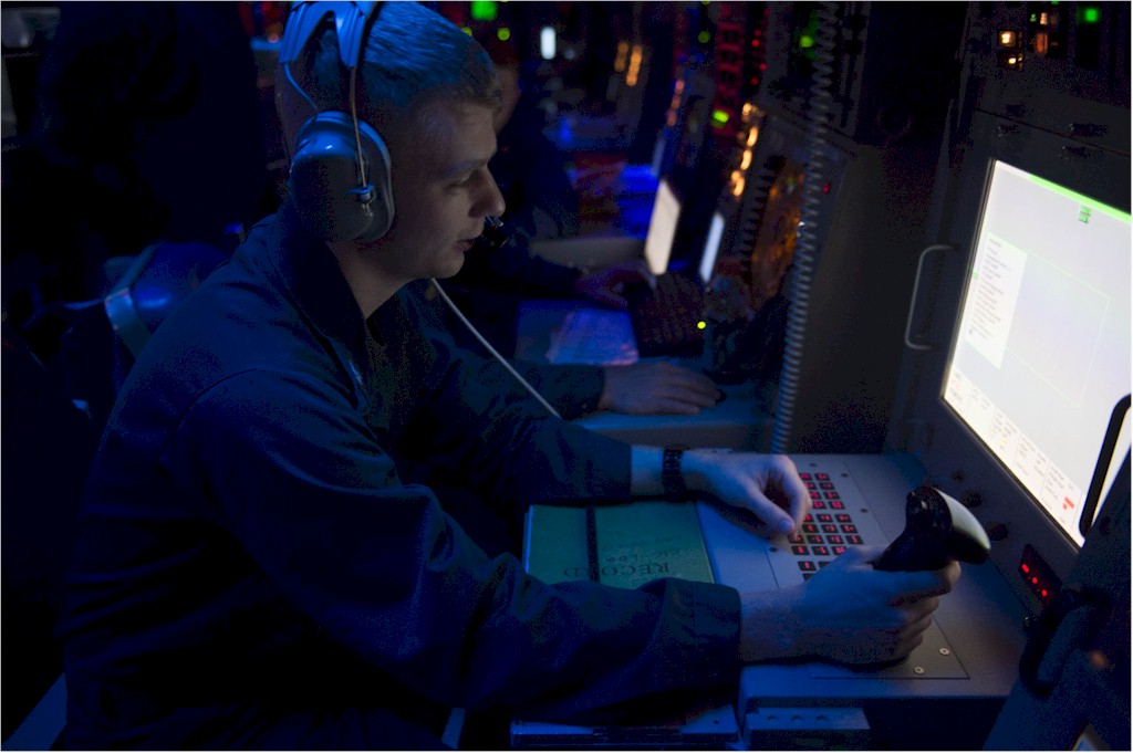 | 126k | 131118-N-UD469-003. Mediterranean Sea, November 18 2013, Firecontrolman 2nd Class Matthew Compton assesses information at the remote control system in the combat information center of the guided-missile destroyer USS Stout (DDG 55). Stout, homeported in Norfolk, Va., is on a scheduled deployment supporting maritime security operations and theater security cooperation efforts in the U.S. 6th Fleet area of responsibility. U.S. Navy photo by Mass Communication Specialist 2nd Class Amanda R. Gray, USN. | Robert M. Cieri |
