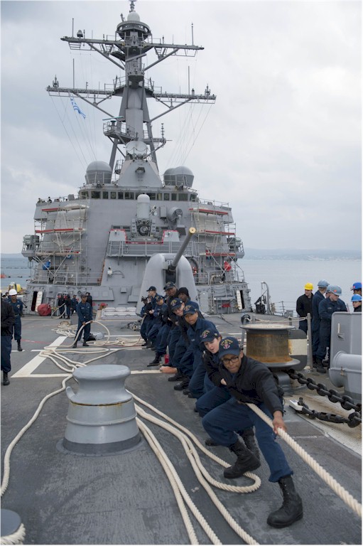 | 100k | 131217-N-UD469-399. Souda Bay, Greece, December 17 2013, sailors man the lines on the foc'sle of the Arleigh Burke-class guided-missile destroyer USS Stout (DDG 55) while rotating the ship for ammunition handling during a voyage repair availability at Naval Support Activity Souda Bay. Stout, homeported in Norfolk, Va., is on a scheduled deployment supporting maritime security operations and theater security cooperation efforts in the U.S. 6th Fleet area of responsibility. U.S. Navy photo by Mass Communication Specialist 2nd Class Amanda R. Gray. | Robert M. Cieri |