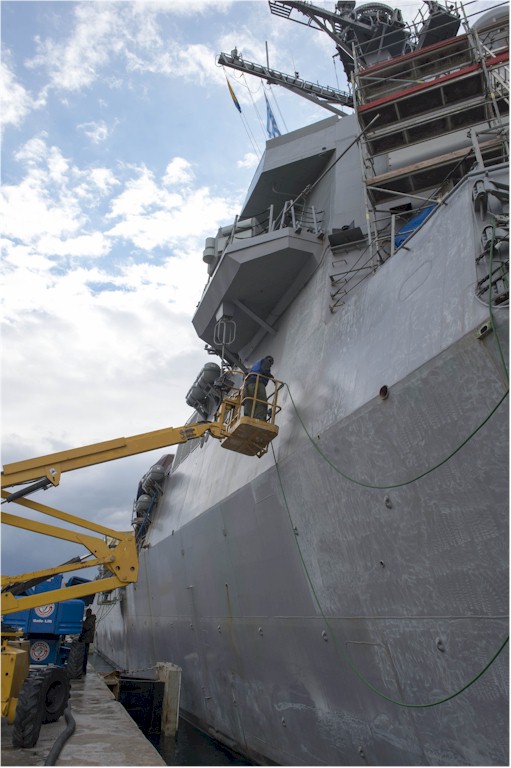 | 97k | 131218-N-UD469-023. Souda Bay, Greece, December 18 2013, Boatswain's Mate Seaman Apprentice Marlon Shackelford sands the hull of the guided-missile destroyer USS Stout (DDG 55) during a voyage repair availability at Naval Support Activity Souda Bay. Stout, homeported in Norfolk, Va., is on a scheduled deployment supporting maritime security operations and theater security cooperation efforts in the U.S. 6th Fleet area of responsibility. U.S. Navy photo by Mass Communication Specialist 2nd Class Amanda R. Gray. | Robert M. Cieri |