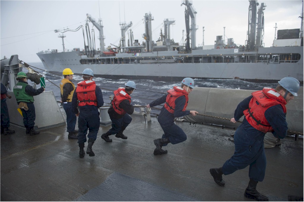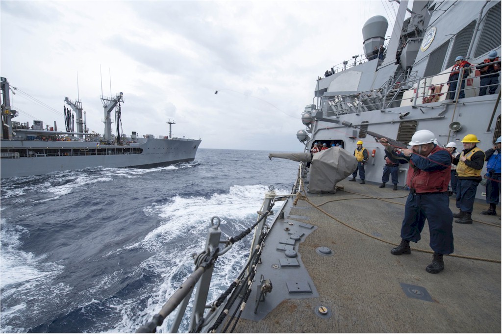 | 148k | 140214-N-UD469-151. Mediterranean Sea, February 14 2014, sailors heave a line aboard the Arleigh Burke-class guided-missile destroyer USS Stout (DDG 55) during a replenishment-at-sea with the Military Sealift Command fleet replenishment oiler USNS John Lenthall (T-AO 189). Stout is on a scheduled deployment supporting maritime security operations and theater security cooperation efforts in the U.S. 6th Fleet area of responsibility. U.S. Navy photo by Mass Communication Specialist 2nd Class Amanda R. Gray. | Robert M. Cieri |