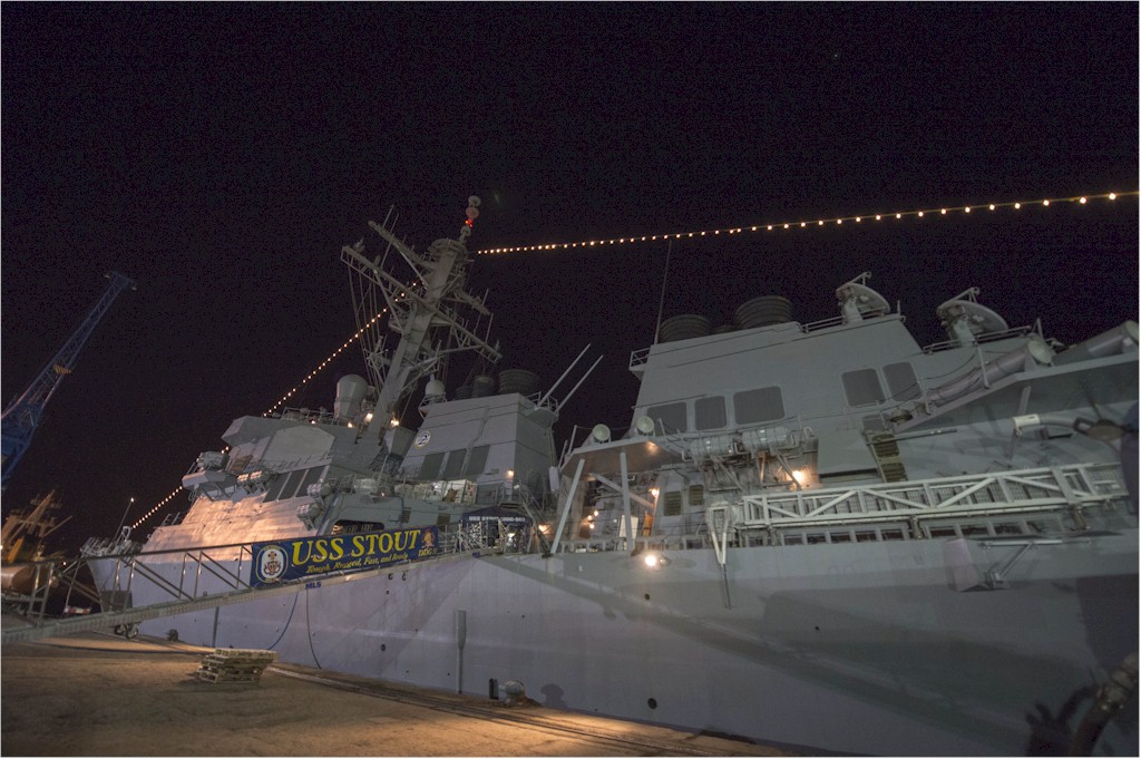 | 184k | 131225-N-UD469-050. Limassol, Cyprus, December 25 2013, the Arleigh Burke-class guided-missile destroyer USS Stout (DDG 55) is illuminated with friendship lights as the ship is moored in Limassol for Christmas. Stout, homeported in Norfolk, Va., is on a scheduled deployment supporting maritime security operations and theater security cooperation efforts in the U.S. 6th Fleet area of responsibility. U.S. Navy photo by Mass Communication Specialist 2nd Class Amanda R. Gray. | Robert M. Cieri |