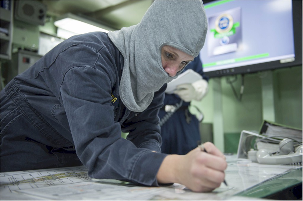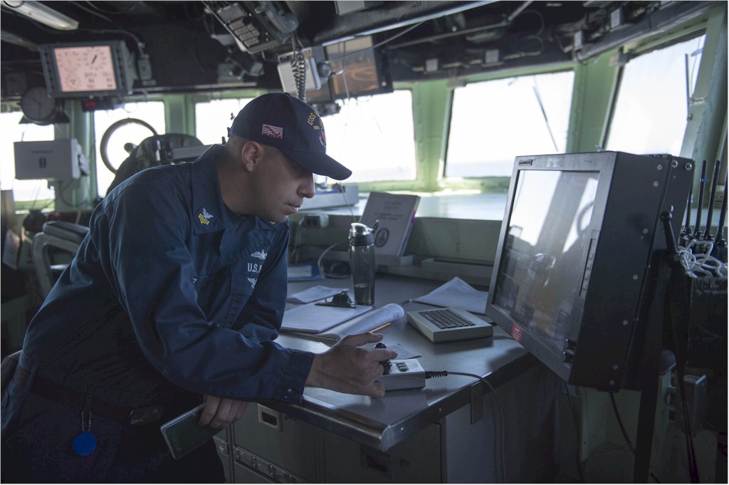 | 131k | 140212-N-UD469-048. Editerranean Sea, February 12 2014, Quartermaster 1st Class Jose Perez watches the Voyage Management System on the bridge of the Arleigh Burke-class guided-missile destroyer USS Stout (DDG 55) during a transit through the Eastern Mediterranean Sea. Stout is on a scheduled deployment supporting maritime security operations and theater security cooperation efforts in the U.S. 6th Fleet area of responsibility. U.S. Navy photo by Mass Communication Specialist 2nd Class Amanda R. Gray. | Robert M. Cieri |