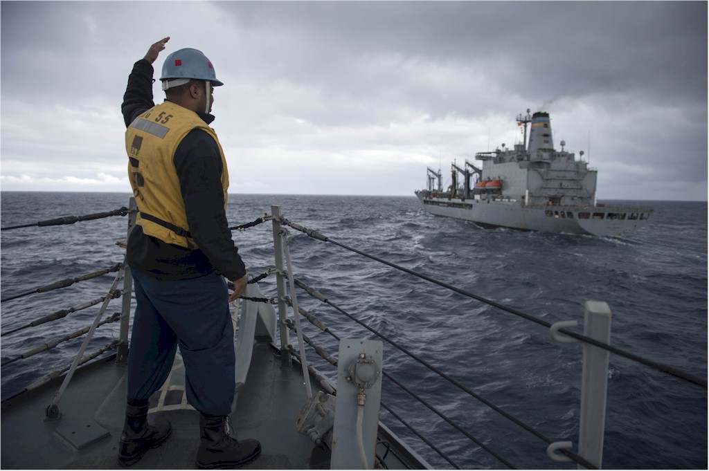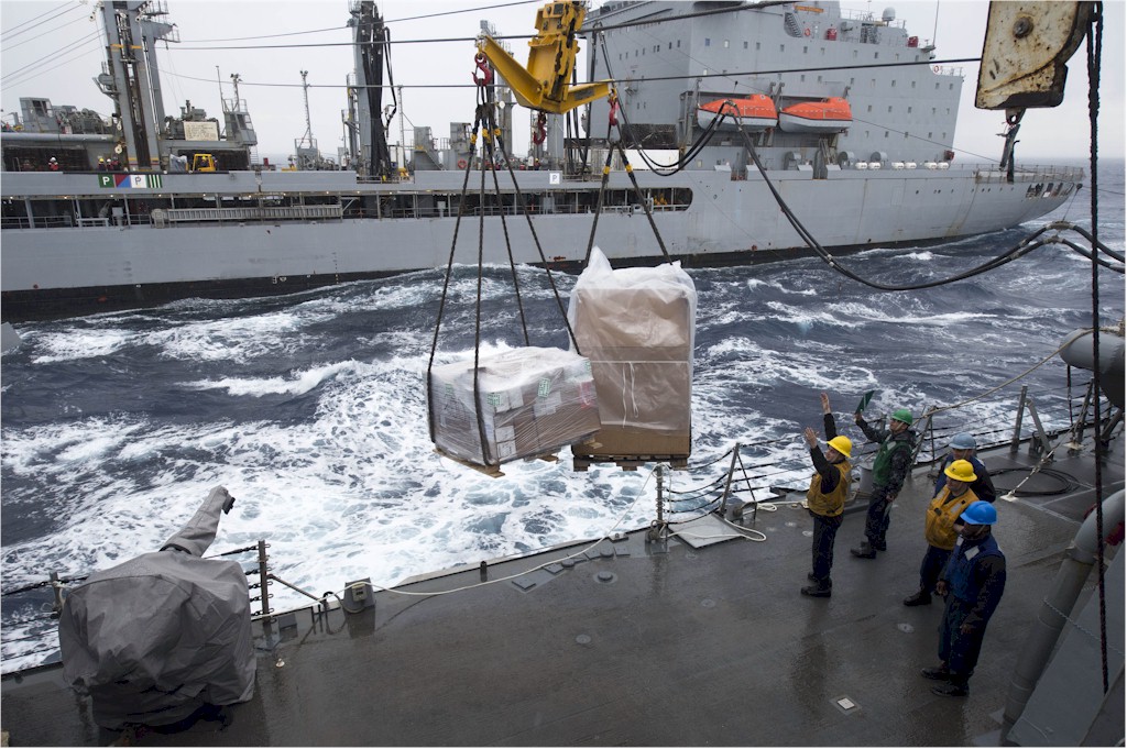 | 226k | 140214-N-UD469-228. Mediterranean Sea, February 14 2014, sailors aboard the Arleigh Burke-class guided-missile destroyer USS Stout (DDG 55) receive pallets of supplies from the Military Sealift Command fleet replenishment oiler USNS John Lenthall (T-AO 189) during a replenishment-at-sea. Stout is on a scheduled deployment supporting maritime security operations and theater security cooperation efforts in the U.S. 6th Fleet area of responsibility. U.S. Navy photo by Mass Communication Specialist 2nd Class Amanda R. Gray. | Robert M. Cieri |