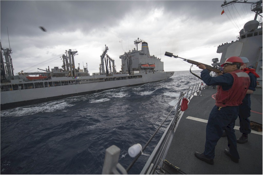 | 144k | 140214-N-UD469-094. Mediterranean Sea, February 14 2014, Gunner's Mate 3rd Class Christian Davis fires a shot line from the Arleigh Burke-class guided-missile destroyer USS Stout (DDG 55) during a replenishment-at-sea with the Military Sealift Command fleet replenishment oiler USNS John Lenthall (T-AO 189). Stout is on a scheduled deployment supporting maritime security operations and theater security cooperation efforts in the U.S. 6th Fleet area of responsibility. U.S. Navy photo by Mass Communication Specialist 2nd Class Amanda R. Gray. | Robert M. Cieri |