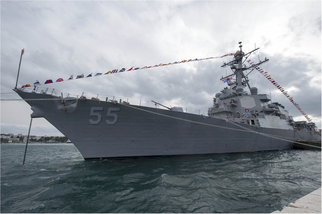 | 132k | 140219-N-UD469-530. Split, Croatia, February 19 2014, the Arleigh Burke-class guided-missile destroyer USS Stout (DDG 55) displays a full dress ship in observance of President's Day while moored, during a routine port visit. Stout, homeported in Norfolk, Va., is on deployment supporting maritime security operations and theater security cooperation efforts in the U.S. 6th Fleet area of responsibility. U.S. Navy photo by Mass Communication Specialist 2nd Class Amanda R. Gray. | Robert M. Cieri |