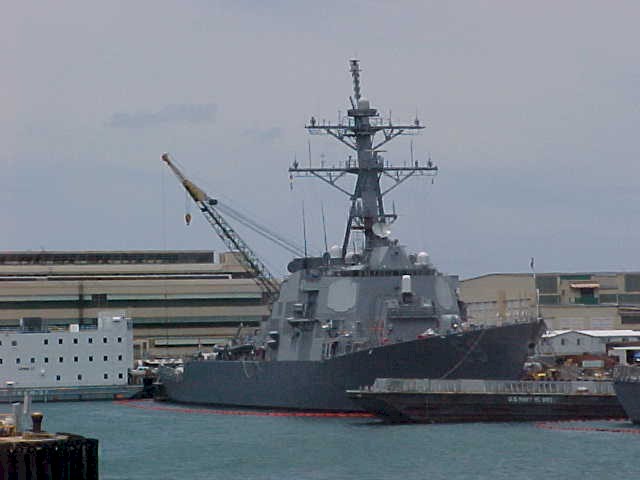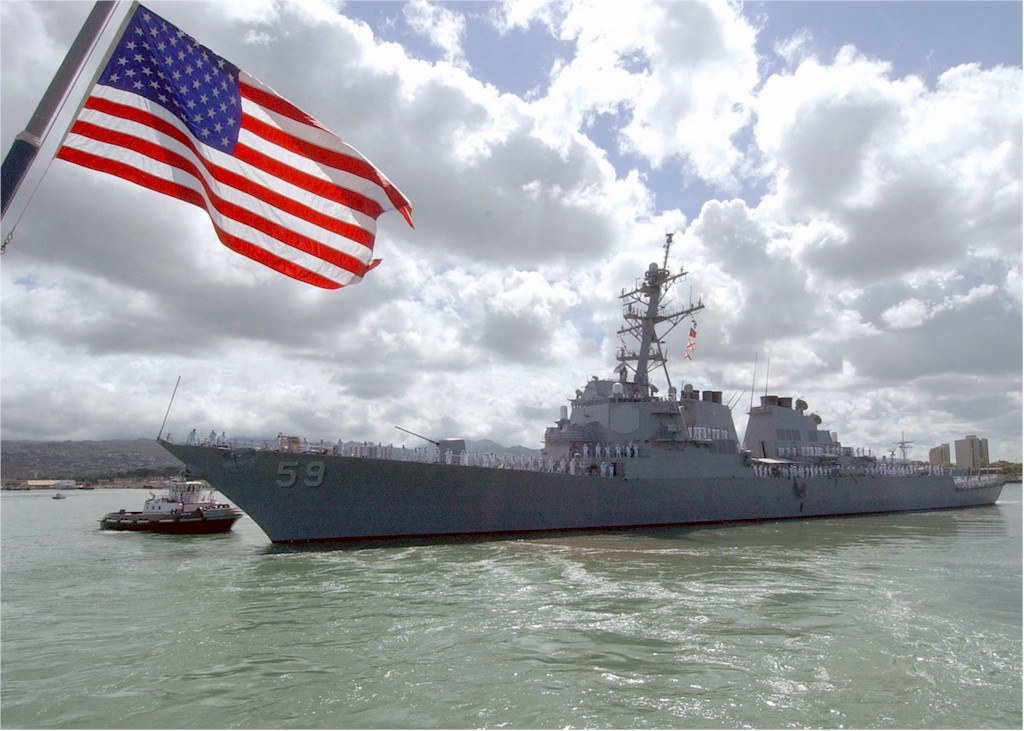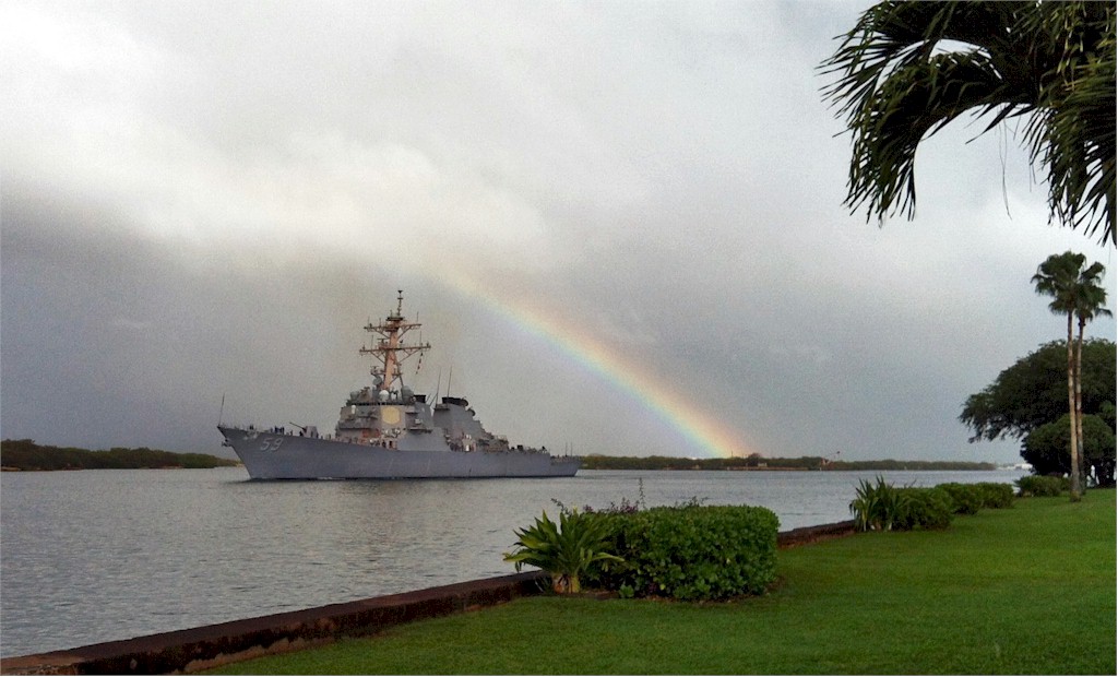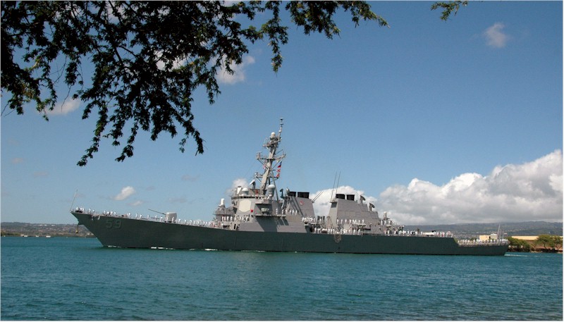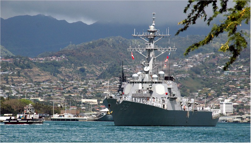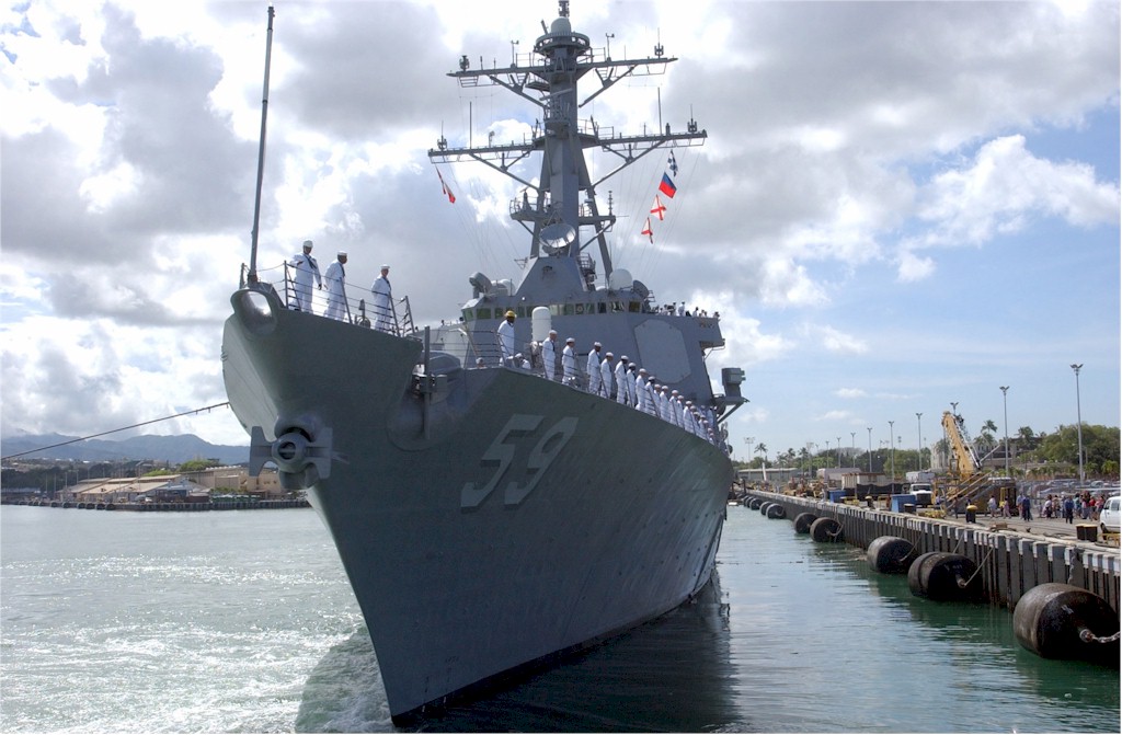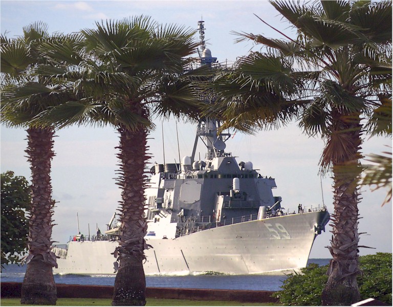 | 104k | 030901-N-4033C-023, Pearl Harbor, Hawaii September 2 2004, guided missile destroyer USS Russell (DDG 59) passes Hospital Point, Hawaii, after returning from a routine four-month deployment to the Western Pacific Ocean. Russell and her crew of more than 330 Sailors participated in the Cooperation Afloat Readiness and Training (CARAT), a series of exercises in Singapore, Thailand, Malaysia, Brunei and the Philippines. U.S. Navy photo by Photographer's Mate 3rd Class Jimmie J. Crockett. | Bill Gonyo |