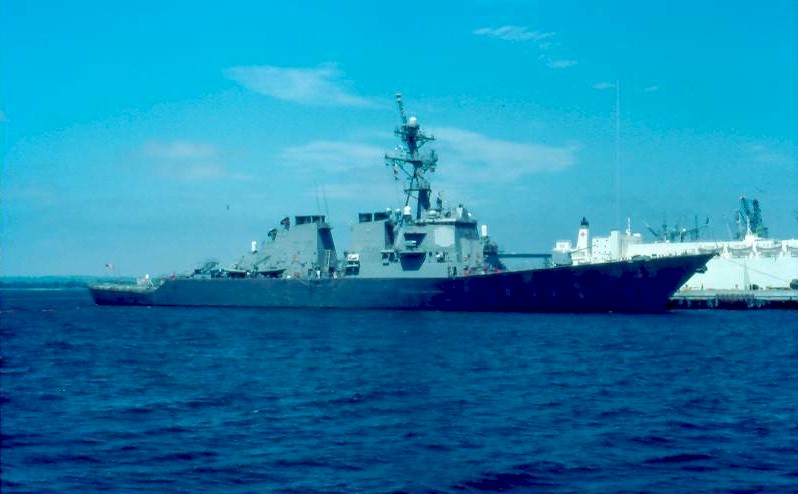 | 66k | Dili, East Timor, USS Russell (DDG-59) at anchor in Dili Harbor here in June, 2000. Russell provided logistical support for the United States Group in East Timor (USGET). East Timor, a small island nation just north of Australia, was recently devastated by Indonesian forces following its vote for independence. Each month, the U.S. Navy deploys one ship to Dili to assist USGET's humanitarian relief efforts in coordination with the United Nations. U.S. Navy photo. | Bill Gonyo |